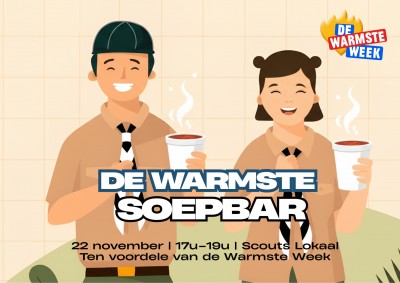 Op zaterdag 22 november openen we van 17u-19u de deuren van ons lokaal voor een gezellige soepbar! Iedereen is welkom om samen een kom zelfgemaakte soep te drinken en te genieten van een warme, fijne avond ten voordele van de Warmste Week.